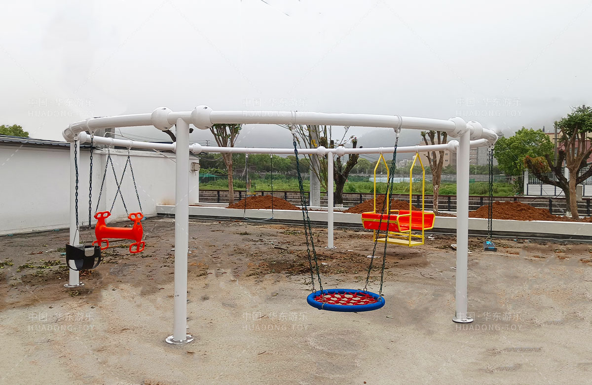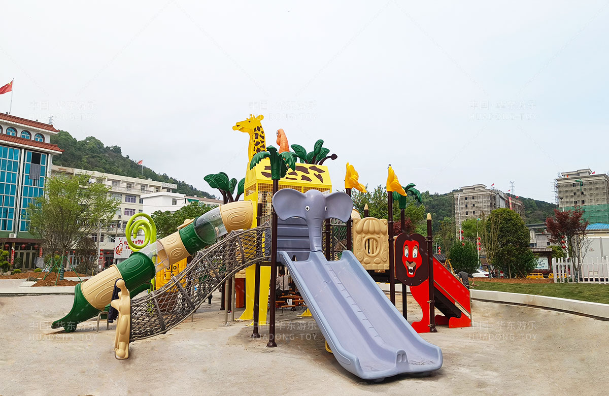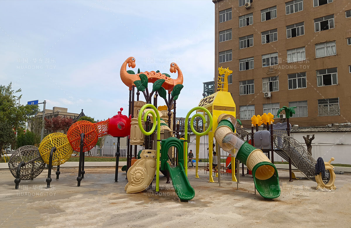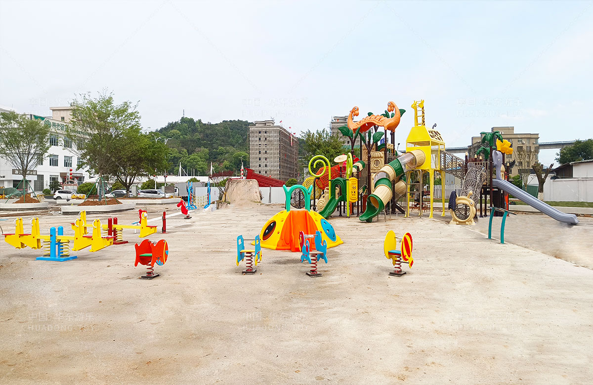 • 乐清市溪西工业园区休闲文化生态园是一个免费的文旅公园,主要为生活在这里的人群提供一个休闲、娱乐、遛娃、健身的场所,在该项目中选用的的乐鱼运动有了自主研发和生产的动物系列组合滑梯,该滑梯具有功能齐全、玩法多样、颜色艳丽等特点,除此之外还新增了儿童 摇摇乐、组合秋千、跷跷板、打击乐器、脚踏旋转座椅等游乐设备。