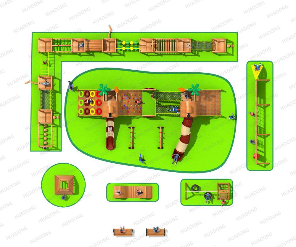 木质拓展设施采用天然木材打造,设计注重安全与挑战并重。通过悬挂桥、攀爬网、平衡木等多样化的障碍元素,旨在提升参与者的体能、平衡感及团队协作能力,同时享受亲近自然、挑战自我的乐趣。